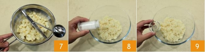Place the blanched celery root chunks in a food mill 7 or potato masher and process them to obtain a puree; add salt 8, white pepper 9