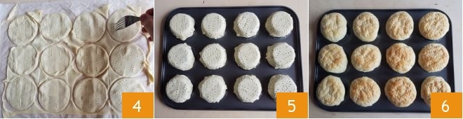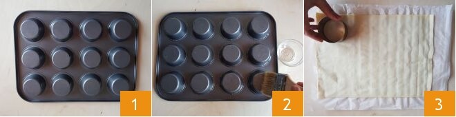 To make the vegetable baskets, first get a cupcake mold and turn it upside down 1, brush the outer bottom and edge with corn oil 2. Take the puff pastry and use a round cutter of 4 inches to cut out 12 discs 3,