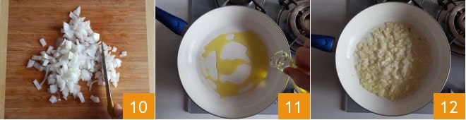 Peel and finely chop the onion 10. Pour the oil into a pan 11, add the chopped onions 12 and let them lightly brown.