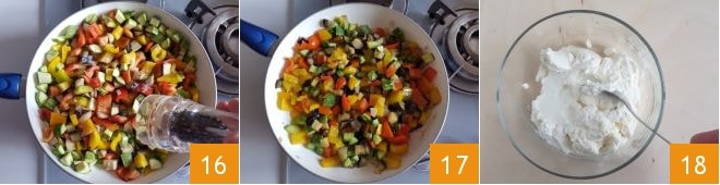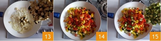 Then add the eggplant cubes 13, then the peppers 14, and finally the zucchini 15.