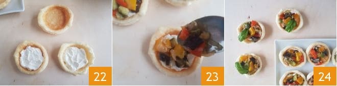fill them with ricotta 22 and vegetables 23, scent with basil leaves 24, and serve your vegetable baskets.