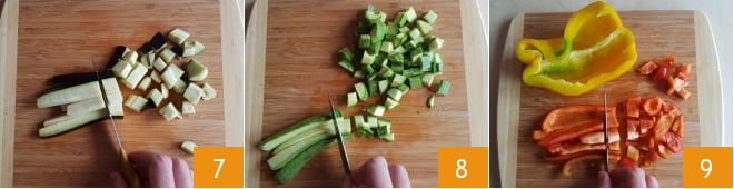 Meanwhile, prepare the filling: wash, dry the vegetables, and cut them into cubes about 1/2 inch. Start with the eggplant: trim it and then cut it first into slices, then into strips, and finally into cubes 7. Do the same for the zucchini 8 and for the red and yellow peppers 9.