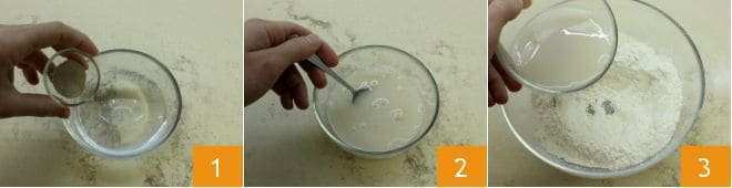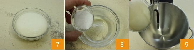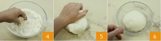 Work the dough with your hands in the bowl 4, then transfer it to a floured surface and handle it to obtain a soft and homogeneous mixture 5. Place it in a small bowl 6 and let it rise covered with plastic wrap for about 30 minutes.