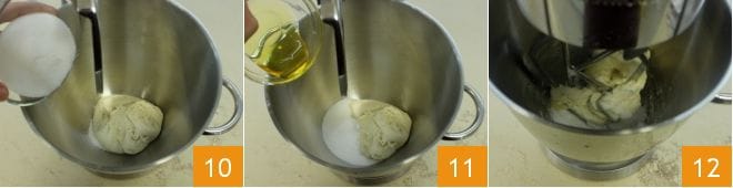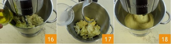 When the yolks are incorporated into the dough, add the olive oil in a thin stream 16. Then replace the K-beater with the dough hook and add the water in which you dissolved the salt 17. Continue kneading until you obtain a smooth and soft dough 18.