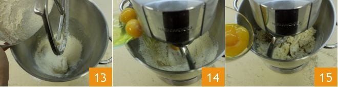 Gradually add the sifted flour 13 while continuing to run the beaters at medium speed, then also pour in the eggs 14, and when they are fully incorporated, add the egg yolks 15.