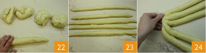 Place it on a lightly floured work surface, divide it into 5 pieces, and handle them to obtain 5 strands 22 of the same length and thickness. Now that you have all the strands 23, seal them at one end 24.