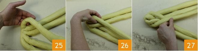 Continue in this way 28 until you finish the dough 29 and slightly roll the end 30, before folding it under the challah.