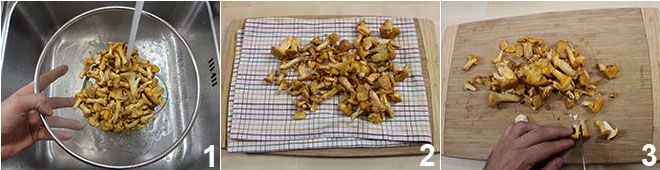 To prepare the chanterelle and Gruyere crostini, wash the chanterelle mushrooms very quickly under cold running water and dry them with a clean cloth (1-2). Alternatively, if they are not very dirty, wipe them with a damp and soft cloth. Cut the larger chanterelles into smaller pieces 3.