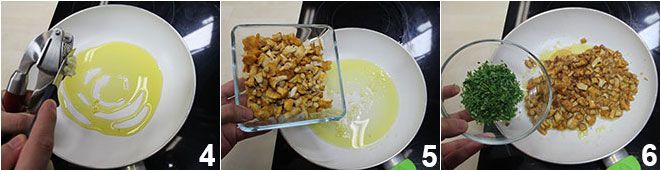 In a pan, place the extra virgin olive oil and the well-crushed garlic 4, sauté for a minute, and add the chanterelles 5, which you will cook over low heat for 5 minutes. Add the finely chopped parsley 6,