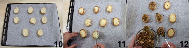 Place the bread slices on a baking sheet 10, turn on the grill, and bake them for a minute until they are toasted. At this point, place some Gruyere cheese on each crostini 11 and gratinate for another minute, then place a spoonful of chanterelles on each bread slice, and you will be ready to serve your chanterelle and Gruyere crostini.