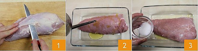 To prepare the chateaubriand with béarnaise sauce, first take the piece of beef and trim it as needed 1; you can also ask your trusted butcher to perform this operation. Place the chateaubriand in a large baking dish and coat it with extra virgin olive oil 2; then add some salt 3 and