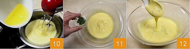 When the mixture is frothy, place the bowl over a pot of boiling water, cooking the sauce in a double boiler, and now pour the warm clarified butter into the yolk mixture 10 and continue whisking until you obtain a smooth, soft, and homogeneous mixture, similar to the consistency of zabaglione, which, when poured, forms ribbons. Remove the sauce from the heat and transfer it to a bowl; adjust with salt, pepper, and add, if desired, a few drops of lemon juice and finally the remaining tarragon 16. Stir to combine all the flavors, and the béarnaise sauce will be ready 18. Keep it warm with a sheet of plastic wrap in contact.