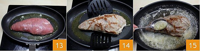 Now take back the chateaubriand: in a large non-stick pan, melt the butter (you can also use clarified butter), and when it is very hot, place the filet 13 and cook it quickly over high heat on both sides to prevent the juices from escaping, then turn the meat 14. When a nice golden crust has formed on the outside, continue cooking for another 5-8 minutes, basting the filet with the melted butter 15. The chateaubriand must be well-cooked on the outside while remaining tender and rare on the inside: the cooking should be quick, about 10-15 minutes.