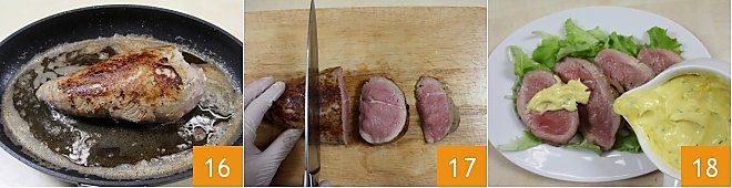 Turn off the heat and let the meat rest so the juices can redistribute inside 16. Now all that remains is to slice the filet with a sharp meat knife, obtaining slices about 1/2 inch thick 17 and placing the chateaubriand on a serving plate over a bed of fresh greens! Your chateaubriand is ready to be served: place the béarnaise sauce directly over the meat 18 or serve it in a separate bowl.