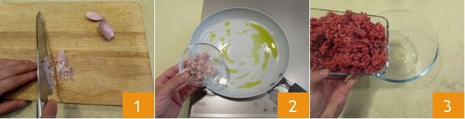 To prepare the cheeseburgers, first finely chop the two shallots 1 and place them in a non-stick pan with a tablespoon of oil, sautéing them over low heat 2. Meanwhile, prepare the meat: place the ground beef in a large bowl 3.