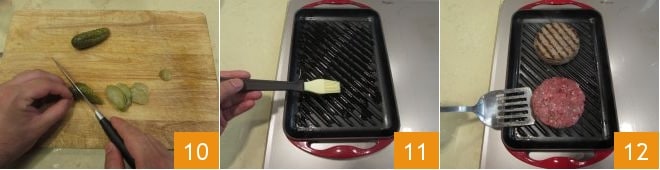 Slice the pickles lengthwise (if you have larger pickles in brine, slice them) 10. Remove the patties from the refrigerator, bringing them to room temperature, then heat a grill pan and brush it with olive oil 11; place the patties on the grill and cook them for 4 minutes on each side, turning them only once with a spatula: be careful not to press down on the patties while cooking them, or they will lose their juices and become drier and tougher 12.