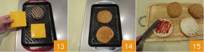 After 4/5 minutes, turn the patties over and, when the cooking is almost done, add a slice of cheese 13, which will melt very quickly. Meanwhile, in another pan, toast the cut side of the bun for about 20 seconds 14. Begin assembling the cheeseburger: spread ketchup on the bread 15