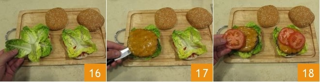 And place the hearts of lettuce on top 16, then the patty with the cheese 17, followed by a few slices of tomato 18,