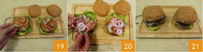 of pickle 19 and red onion 20. Finally, cover with the other slice of bread and serve the cheeseburgers hot immediately 21.