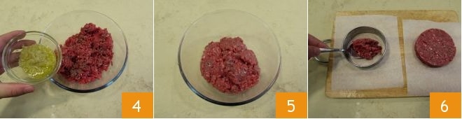 Add the chopped shallots to the ground meat 4 and mix the ingredients well with your hands 5. Divide the ground meat into 4 equal parts and with a spoon, place it in a ring mold about 0.8 inches high and 4 inches wide. Press the ground meat with the back of the spoon to form the patties 6.