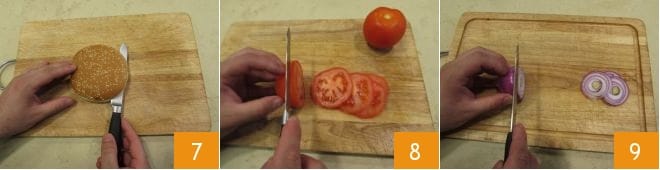 Cover them and keep them in the refrigerator. Then prepare the garnishes for the cheeseburger: cut the buns in half 7, slice the tomato with a knife 8 and the red onion finely 9.