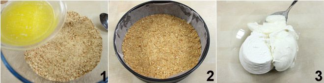 To prepare the cheesecake with a scent of roses, start by finely chopping the cookies, then incorporate the melted butter 1 and mix well, then pour the mixture into a 9.5-inch springform pan lined with parchment paper and use a spoon to compact the cookie base 2. Chill the mixture in the refrigerator or freezer for about ten minutes. In the meantime, place the ricotta and Philadelphia in a bowl 3, and mix