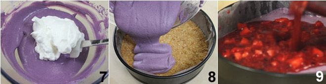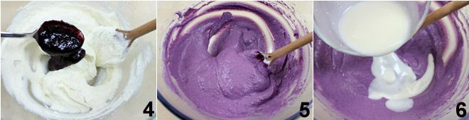 and incorporate the rose and blueberry jam 4 (prepared with 200g of rose petals, 400g of water, 1 apple, lemon juice, and 100g of blended blueberries), and blend it into the cheeses 5. Then add the gelatin dissolved in a little warm cream 6