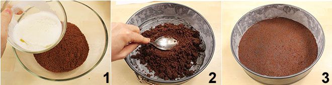 To prepare the triple chocolate cheesecake, start by preparing the base: put the cocoa cookies in the blender and finely chop them. Melt the butter in a saucepan; meanwhile, place the chopped cookies in a bowl and gradually add the melted butter 1 mixing everything well. Butter a round cake pan, preferably springform, with a diameter of 9 inches; at this point, you can line the pan with parchment paper: cut a parchment paper disc of the same diameter as the base of the cake pan and two strips the same height as the sides, then line the cake pan itself. Pour the crumbled cookies into the parchment-covered cake pan 2 and compact the cookie base well with the help of a spoon 3. Let the mixture cool in the refrigerator for half an hour or in the freezer for about ten minutes.