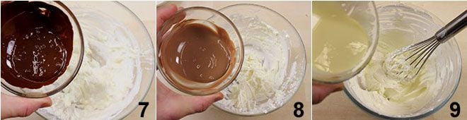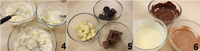 Now focus on the filling: prepare three bowls for the three creams and place 250 g (9 oz) of cream cheese in each, stirring to soften it 4. Meanwhile, melt the 3 types of chocolate separately in a double boiler (or microwave) (5-6).