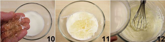 Now take three bowls and soften the gelatin needed for each cream (3 g) separately in cold water for 10 minutes. Then take another 3 bowls and pour 1/3 cup of previously heated cream into each, and dissolve the well-wrung gelatin in each (3 g per bowl) (10-11). In the end, you should obtain 3 bowls each containing 1/3 cup of cream and 3 g of dissolved gelatin. Incorporate the first of the 3 cream and gelatin mixtures into the white chocolate using a whisk 12.