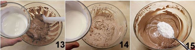 Perform the same operation for the other bowls of cream and gelatin, incorporating them into both milk chocolate and dark chocolate (13-14). Lastly, add the powdered sugar, mixing with a spatula 15.