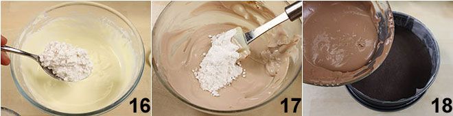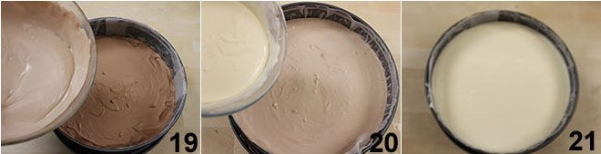 Perform the same operation for all types of chocolate (16-17). Now that the creams are ready, you can assemble the cheesecake. Remove the now cold and compact cookie base from the refrigerator, start by pouring in the dark chocolate cream first 18, and let it rest in the refrigerator or freezer for 15-20 minutes.