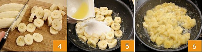 Now start on the filling: peel the bananas and cut them into slices about a quarter inch thick 4, place them in a pan with the butter, the juice of half a lemon, and 1.4 oz of sugar 5. Cook over medium heat until the bananas are soft and creamy 6.