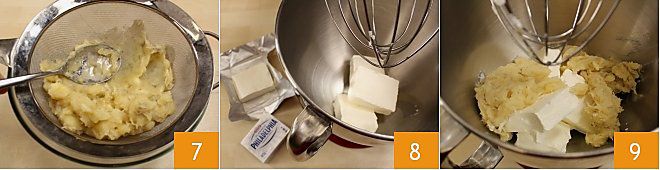 Now pass the cooked bananas through a sieve to obtain a smooth pulp or mash them with a fork 7. In a stand mixer or large bowl, place the fresh spreadable cheese 8, add the banana pulp 9, and finally 2.1 oz of sugar.