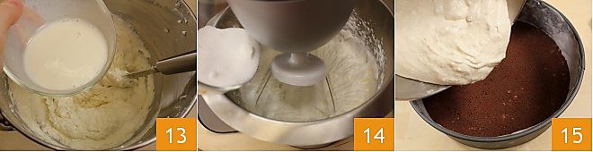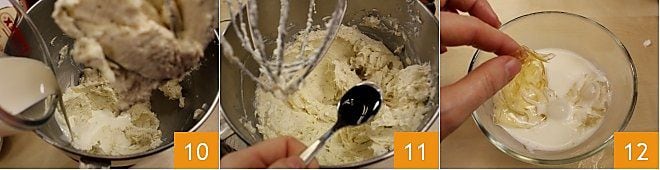 Start mixing the ingredients with the stand mixer whisk. If you don't have a stand mixer, use an electric hand mixer or whisk. Then, gradually add 3.5 fl oz of fresh liquid cream 10 while continuing to mix the mixture. Finally, flavor the cream with a teaspoon of vanilla extract. Alternatively, you can use a packet of vanillin or the seeds of a vanilla pod 11. Then, soften the gelatin in cold water for 10 minutes. For process details, you can check the guide on how to use gelatin. Squeeze the gelatin sheets well and dissolve them in 1 tablespoon of heated liquid cream 12.