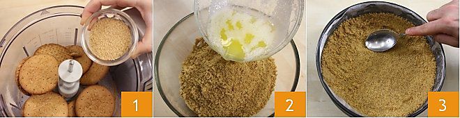 To prepare the caramel and hazelnut cheesecake, start by making the base: put the Digestive biscuits in a mixer along with the brown sugar 1, finely chop them and transfer them to a bowl. Melt the butter in a saucepan or in the microwave and gradually add it to the biscuits 2, mixing well to combine. Butter a cake pan, preferably a springform one, with a diameter of 9 inches and line it with parchment paper (to see how to do it, check here our Cooking School: how to line a cake pan with parchment paper). Pour the crumbled biscuits into the cake pan and use the back of a spoon to compact the biscuit base well 3. Let the base cool in the refrigerator for half an hour or in the freezer for 15 minutes.