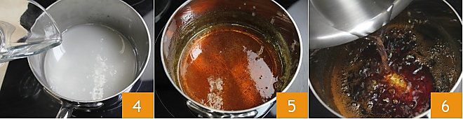 Now focus on the filling starting with the caramel preparation: in a sufficiently large and thick-bottomed saucepan, heat 120 g of granulated sugar with 25 ml of water over low heat 4; the thick bottom helps to evenly distribute the heat, preventing the sugar from burning before it caramelizes. When the sugar has taken on a nice brown color 5, add another 50 ml of hot water 6 and stir quickly. Remove the caramel sauce from the heat and let it cool to room temperature.