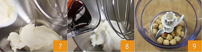In a mixer equipped with a whisk, or in a bowl with the help of a hand whisk, or electric mixer, soften the Philadelphia 7 and slowly add the caramel sauce 8. Meanwhile, chop the hazelnuts in a mixer 9, leaving some whole for the final decoration.