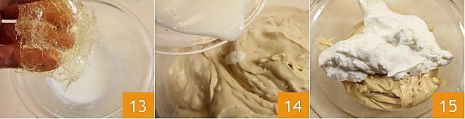 Once softened, squeeze the gelatin and melt it in 2 tablespoons of cream, taken from the total amount, which you have warmed 13. When the mixture has reached room temperature, add the melted gelatin in the cream to the mixture 14. Separately, whip the remaining cream until stiff (How to Whip Cream the Cooking School: how to whip cream) and incorporate it into the cream 15, gently mixing with a spatula from bottom to top.