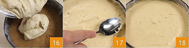 The Philadelphia caramel and hazelnut cream is ready: retrieve the now cold biscuit base and pour the cream over it 16, taking care to set aside two tablespoons of mixture for the final garnish. Finally, level the surface with a spatula or the back of a spoon and put the caramel and hazelnut cheesecake in the refrigerator 18 for at least 4 hours to set. Once the resting time has passed, unmold your cheesecake and decorate the surface with tufts of cream set aside and placed in a piping bag with a star tip, and chopped hazelnuts, and on the edges with the remaining chopped hazelnuts. Here is your caramel and hazelnut cheesecake!