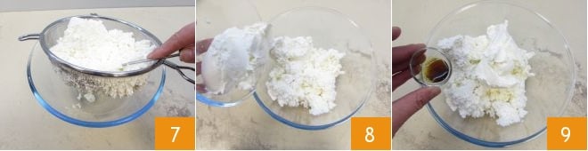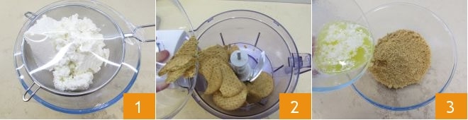 Place everything in the refrigerator for half an hour or in the freezer for about ten minutes, until the cookie mixture is solidified. Sift the drained ricotta into a large bowl 7. In the same bowl, add the cream cheese 8 and vanilla extract 9.