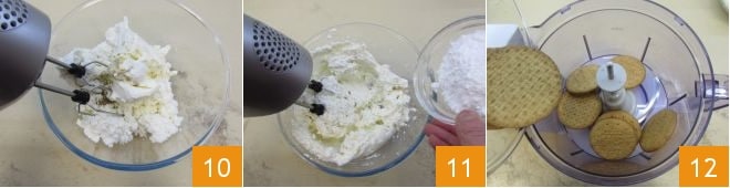 Using an electric mixer, mix well to combine all the ingredients 10; add the powdered sugar and continue to mix with the mixer 11. Once all the sugar is incorporated, add the 120 g of digestive biscuits to the food processor 12.