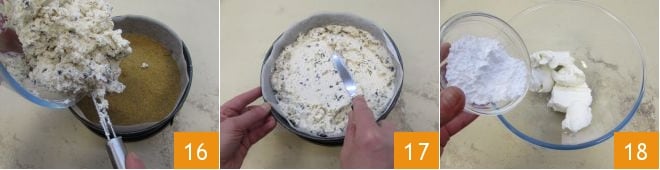 Remove the cheesecake base from the refrigerator, now cold and firm, and pour the prepared cream on top 16. Level the surface with a spatula 17 or the back of a spoon and refrigerate for at least 4 hours to set. After this time, place the 150 g of cream cheese and the 20 g of powdered sugar in a bowl 18.
