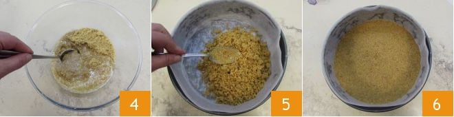 Mix everything well 4 and line a 8.5-inch cake pan with parchment paper. Pour the cookie mixture into the pan 5 and use a spoon to compact the base well 6.