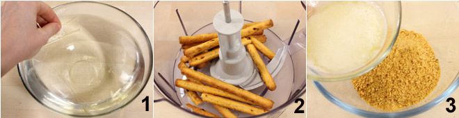 To prepare the savory herb cheesecakes, start by placing the sheets of gelatin in a bowl of cold water, let them soften for about 10 minutes 1, and then squeeze them well. Put the tomato-flavored breadsticks in the mixer 2 and chop them finely, then add the chopped mixture to the melted butter 3 and mix well until you get a soft dough.