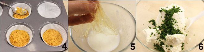Take a muffin tray and line it with paper liners, distribute the obtained mixture in the liners (about one tablespoon per liner), and flatten and level the bases with the back of a spoon 4. Place everything to cool in the refrigerator for at least half an hour. Meanwhile, prepare the filling: dissolve the softened and well-squeezed gelatin in the cream 5 (to avoid pieces of gelatin in the water, it is advisable to strain it with a sieve). Then put the ricotta, fresh cheese, salt, pepper, and chopped herbs (parsley, basil, and chives) in a bowl and mix well 6.