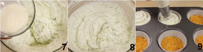 Pour the cream into the herb cheese mixture 7 and stir until you get a homogeneous cream 8, then, using a piping bag, distribute the cream on the cheesecake base 9. Place the cheesecakes in the refrigerator for at least another hour to set the gelatin. Then carefully remove the savory herb cheesecakes from the paper liners and serve them.