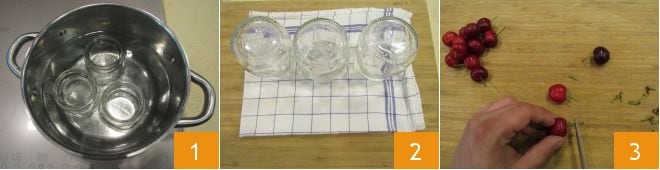 To prepare cherries in grappa, start by sanitizing the jars, as indicated in the guidelines from the Ministry of Health provided at the end of the recipe. Fill a pot with water, add the jars, and let them simmer for about 30 minutes 1. Then, remove them from the water, being careful not to burn yourself, and place them upside down on a kitchen towel 2. Let them dry, and in the meantime, take care of the cherries: wash them and trim the end of the stem with scissors 3.