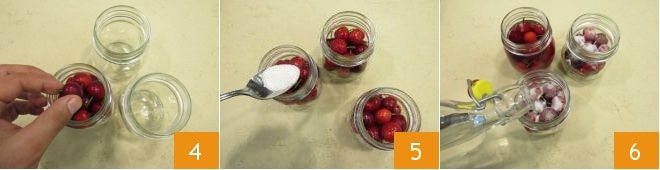 Place the cherries inside the jars 4, add the sugar (about 1 tbsp for each jar) 5, and cover with the grappa 6. Depending on the size of the cherries and the jars you choose, you might have some grappa left over.