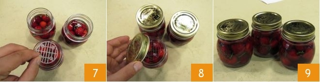 Insert a plastic press inside each jar 7, press well, and close the jars by tightening but not overdoing it 8. Store them to macerate in a cool, dry place for at least 30 days before enjoying your cherries in grappa 9!